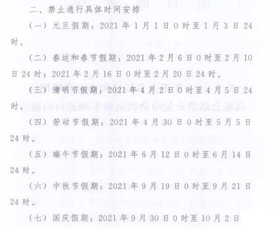 元旦節(jié)、春節(jié)、清明節(jié)、勞動節(jié)、端午節(jié)、中秋節(jié)、國慶節(jié)假日期間,全天禁止物品運輸車在高速公路通行;供應自來水生產(chǎn)用的液氯運輸車輛,燃油、天然氣運輸車輛0時至6時禁止通行,其他時段不受限制。