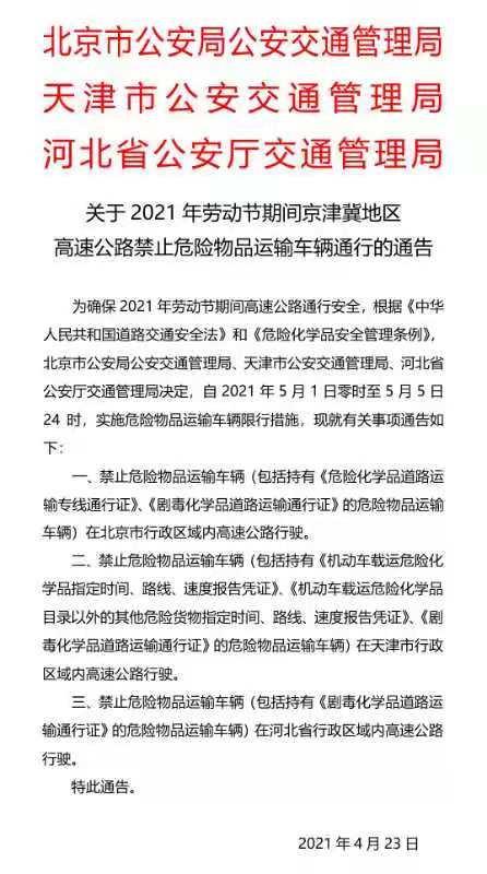 為確保2021年五一勞動節(jié)期間高速公路通行安全,根據(jù)《中華人民共和國道路交通安全法》和《危險化學品安全管理條例》,4月23日,北京市公安局公安交通管理局、天津市公安交通管理局、河北省公安廳交通管理局發(fā)布《關于2021年勞動節(jié)期間京津冀地區(qū)高速公路禁止物品運輸車輛通行的通告》,通告決定,自2021年5月1日零時至5月5日24時,實施物品運輸車輛限行措施。