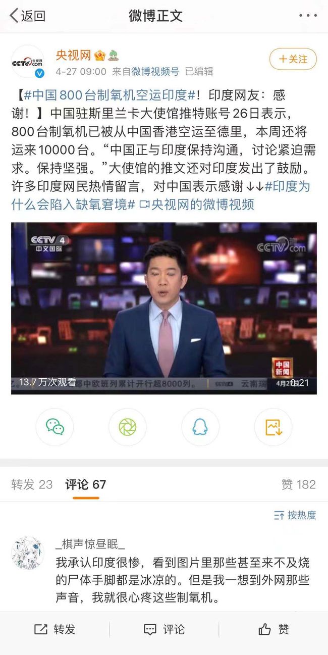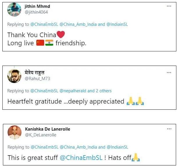 盡管兩人都沒有特別提到制氧機(jī)來自中國,但在我駐斯里蘭卡大使館的那條推文下,絕大多數(shù)印度網(wǎng)民熱情留言,對(duì)中國表示感謝:“中印友好萬歲”、“發(fā)自內(nèi)心地感謝”、“向你們脫帽致敬”。