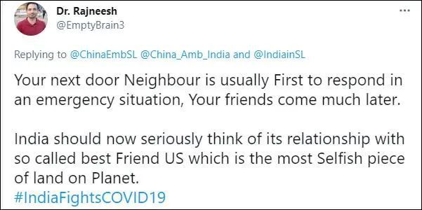 一些印度網(wǎng)民感慨“遠(yuǎn)親不如近鄰”,有人呼吁印度與中國修復(fù)分歧,并“嚴(yán)肅考慮與‘最好的朋友’美國的關(guān)系”。