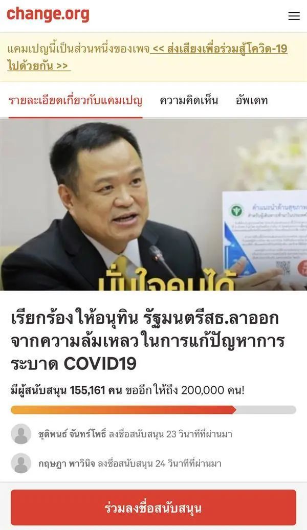 當(dāng)?shù)貢r(shí)間4月25日, 泰國醫(yī)護(hù)工作者在網(wǎng)站上發(fā)起簽名活動(dòng)要求泰國副總理兼衛(wèi)生部長阿努廷辭職 。理由是自泰國新冠疫情暴發(fā)、尤其是今年3月底第三輪疫情暴發(fā)以來,阿努廷未采取足夠應(yīng)對(duì)措施,導(dǎo)致確診病例激增,阿努廷應(yīng)為此負(fù)領(lǐng)導(dǎo)責(zé)任。