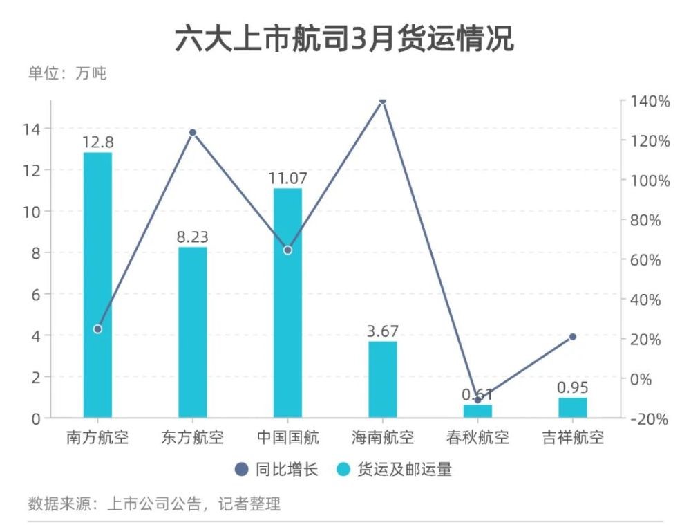 民航局?jǐn)?shù)據(jù)顯示,3月全民航的貨郵運(yùn)輸量為65.5萬(wàn)噸,較疫情前的2019年同期增長(zhǎng)3.7%。