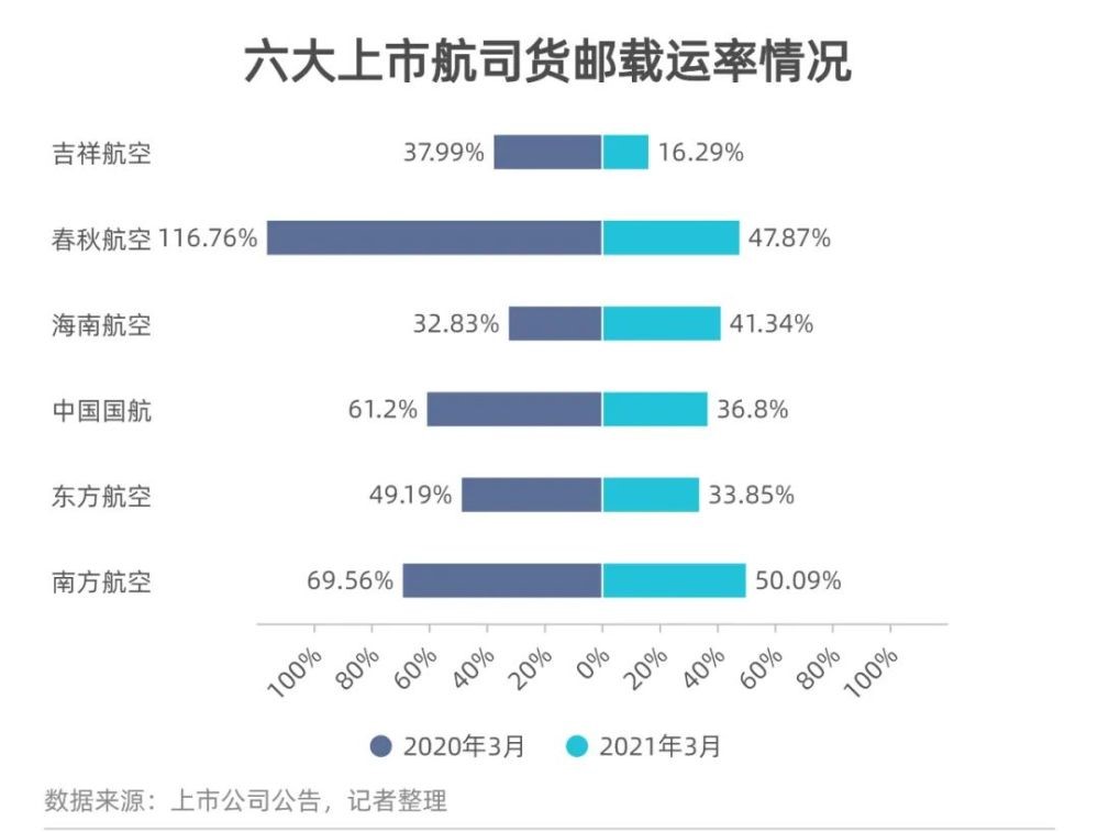 春秋航空的貨郵載運(yùn)率下滑最多,減少68.89個(gè)百分點(diǎn)。